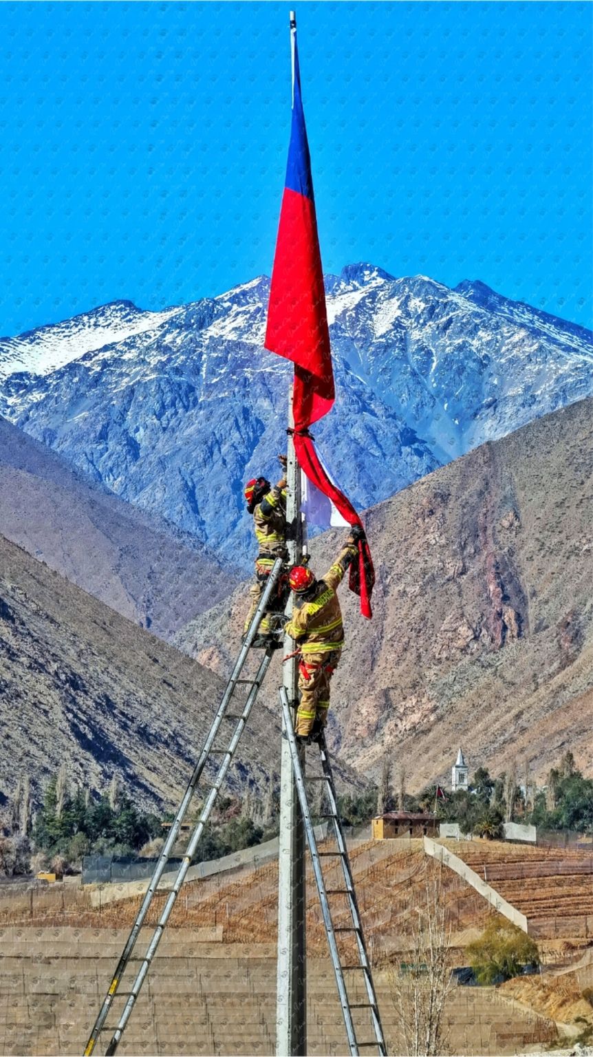 Esta imagen muestra el izamiento de la bandera de Chile en pleno Valle del Elqui, con dos bomberos en acción y la cordillera como fondo. Es una fotografía potente, directa y muy representativa, ideal para oficinas, salas de reuniones, instituciones públicas o privadas, colegios, municipalidades, material gráfico, presentaciones, enmarcados o espacios que busquen identidad, carácter y presencia visual.