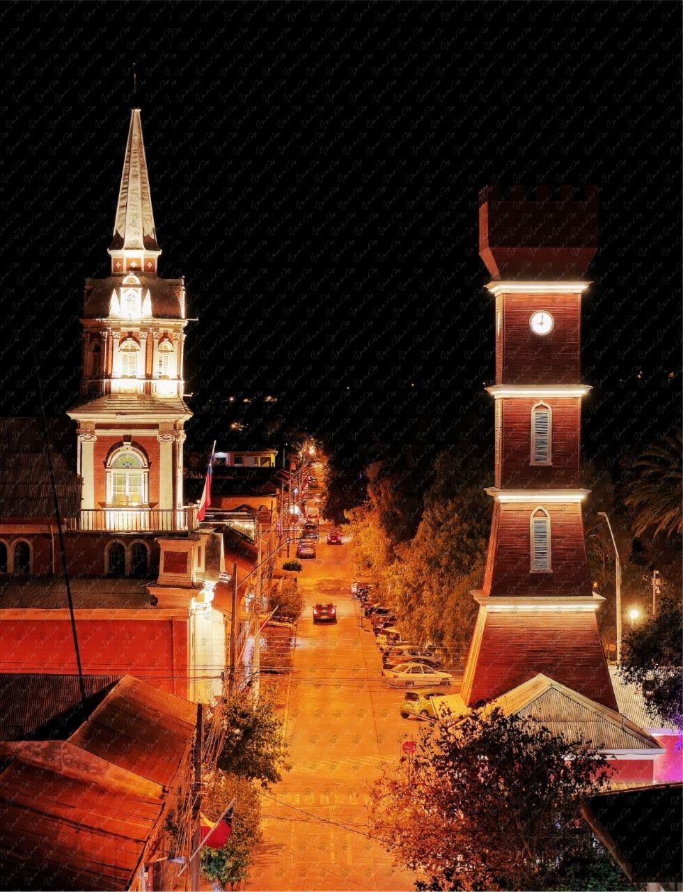 Fotografía nocturna de gran impacto visual que retrata la Iglesia de Vicuña y la Torre Bauer iluminadas, con una composición vertical limpia y simétrica. Ideal para enmarcar y decorar oficinas, restaurantes, hoteles, cafeterías, recepciones, espacios corporativos, proyectos turísticos y comerciales. Una imagen elegante, reconocible y con fuerte presencia visual, perfecta para muros principales y ambientes que buscan identidad, carácter y estética profesional.