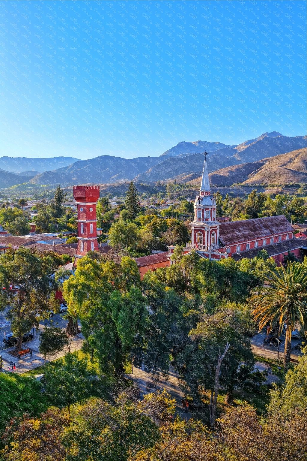 Imagen panorámica de Vicuña vista desde las alturas, donde la Torre Bauer y la iglesia destacan entre áreas verdes y la cordillera de fondo. Ideal para oficinas, restaurantes, hoteles, cafeterías, alojamientos turísticos, salas de espera o para enmarcar y dar carácter a espacios interiores. Una fotografía limpia, luminosa y con fuerte identidad local, perfecta para decorar y aportar valor visual a proyectos profesionales.